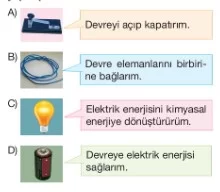Aşağıda resimleri verilen devre elemanlarından hangisi görevini söylerken yanlış yapmıştır?